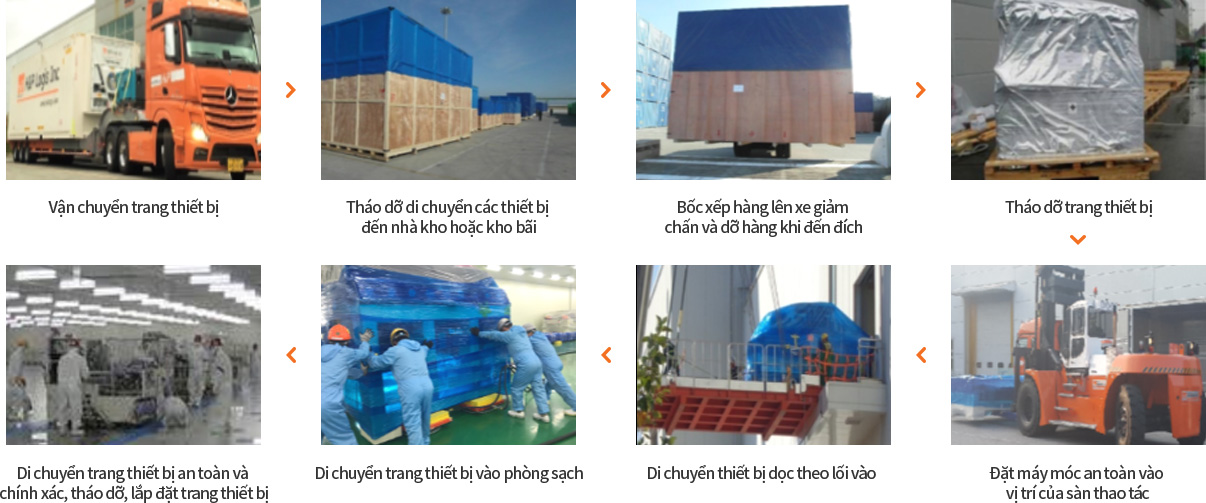 - Các kỹ sư có kinh nghiệm vận chuyển nhiều năm ở nước ngoài thực hiện dự án LCD, OLED, trang thiết bị nhà máy chất bán dẫn